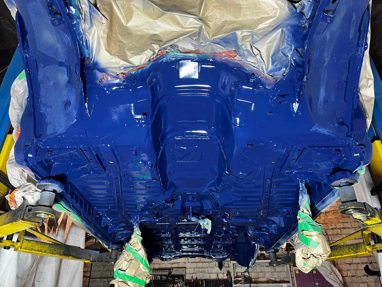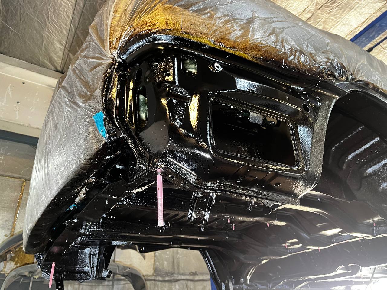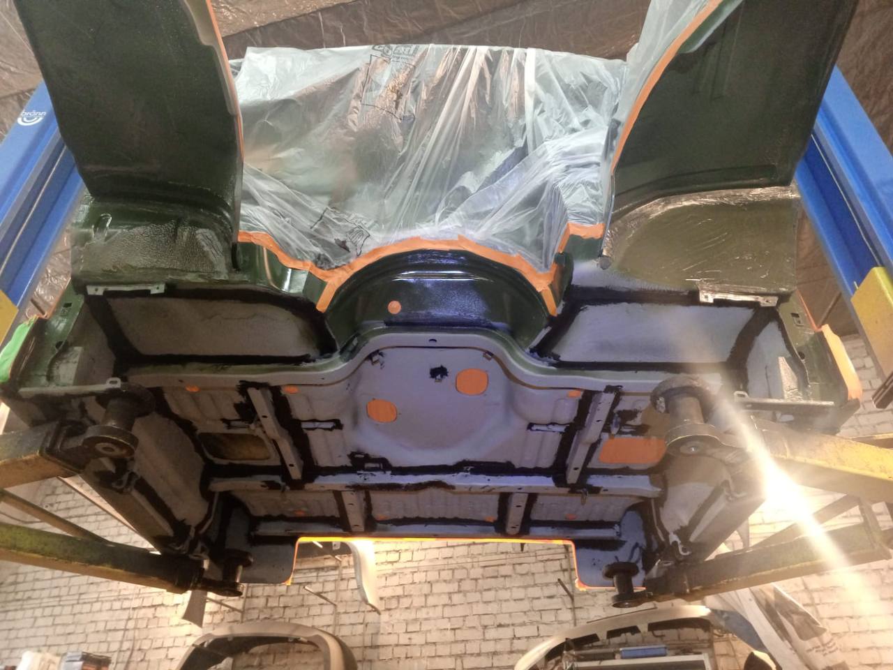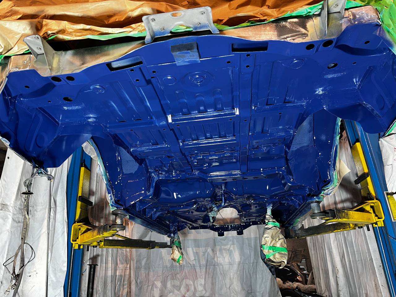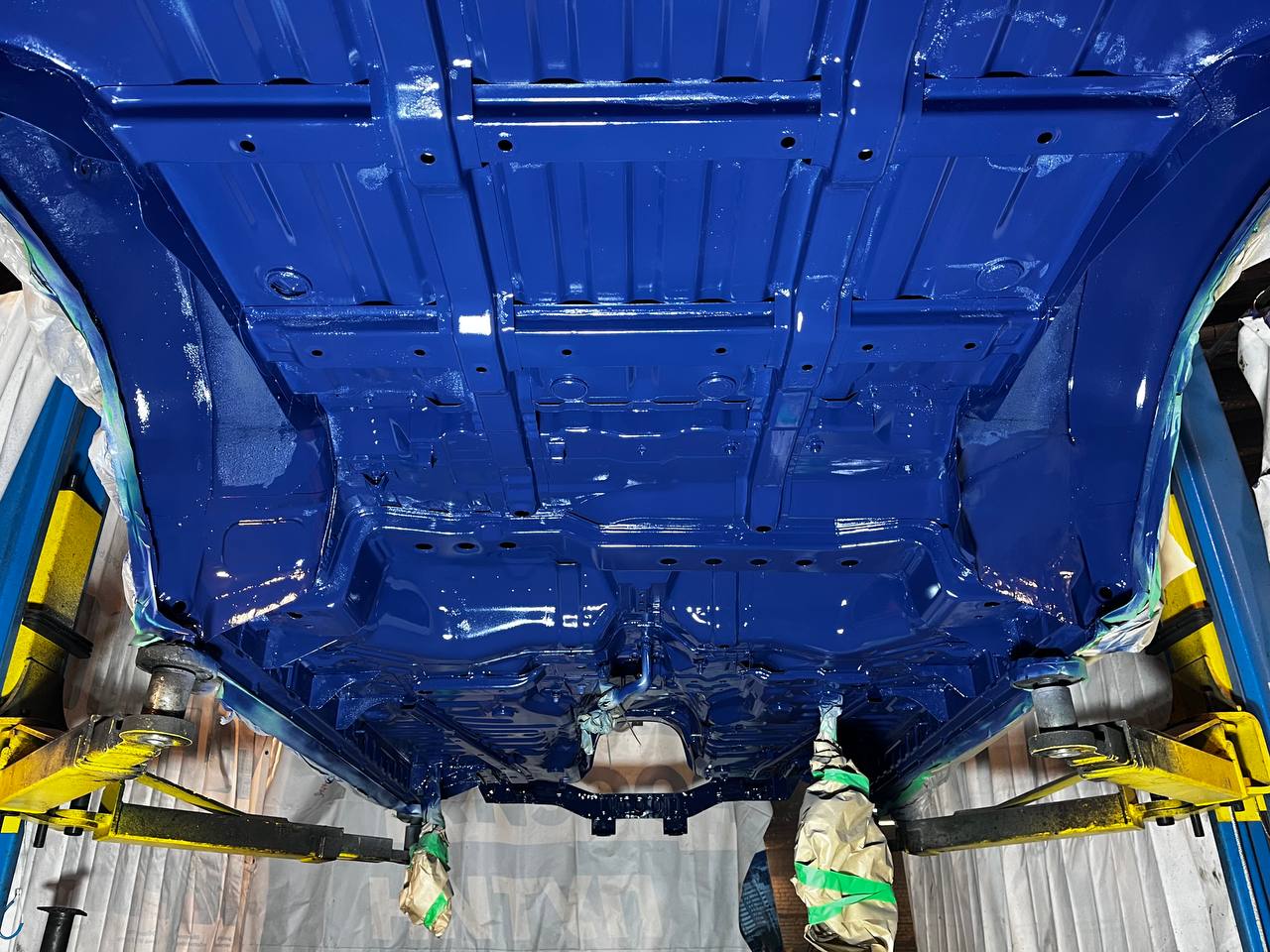 Мы покрываем автомобиль пленкой и проводим тщательную сушку поверхности, используя тепловые пушки для нагнетания горячего воздуха, а также сжатый воздух для просушки труднодоступных мест, рамы и лонжеронов.